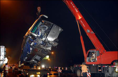 傷者被全部送走后,警察開(kāi)始指揮吊車和清障車清理現(xiàn)場(chǎng)。晚9時(shí)50分,旅行車被吊上清障車拉走,晚10時(shí)15分,大客車被吊上另一輛大型清障車。記者晚上10時(shí)30分離開(kāi)時(shí),警察還在對(duì)現(xiàn)場(chǎng)進(jìn)行勘查。